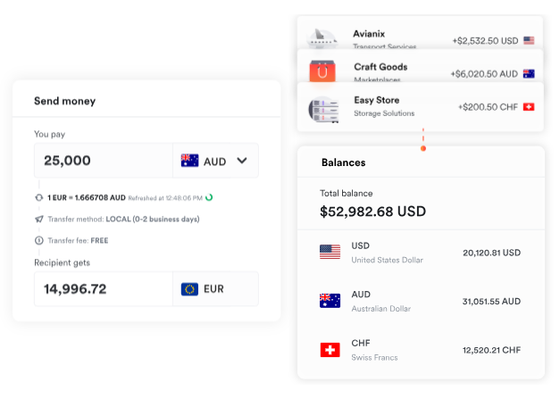 Easily send money to anyone in 47 foreign currencies, directly from your Euro account. You’ll see our low transaction fee and competitive exchange rate upfront, so there are no surprises later.